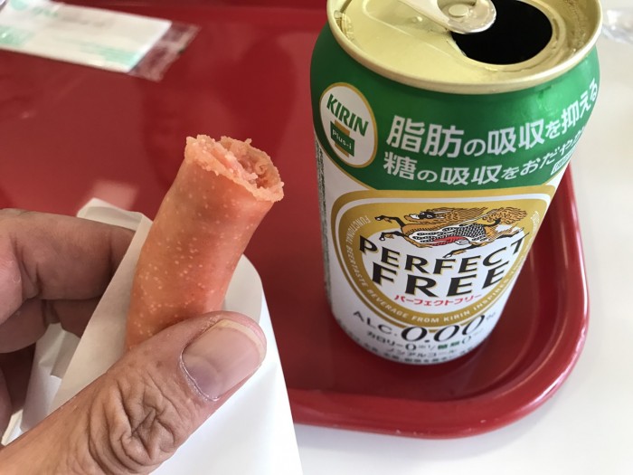 ノンアルコールビールと、それに付く明太子ウインナーを頂きました。明太子ウインナーは美味しかったので、自宅用にウインナーを買って帰りました。
