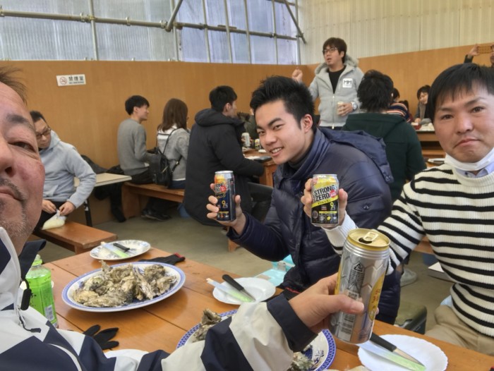 私たちはクーラーボックスに大量のお酒を持ち込んで、牡蠣とのご対面