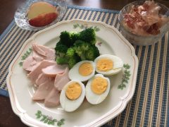 ササミ70g、ブロッコリー100g、豆腐150g、卵2個、リンゴ