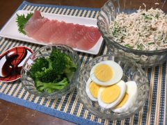 オクラ入りササミ300g、マグロ赤身135g、ブロッコリー100g、卵2個