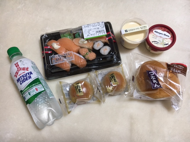 その後にジュース、菓子パン、サーモン寿司も頂きました!