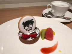 結局謎解きは全て解けませんでしが、スタンプラリーは達成できたので飲食代の割引券を頂きました。その割引券で、ご褒美でコナンのスイーツを食べ幸せそうな娘でした。