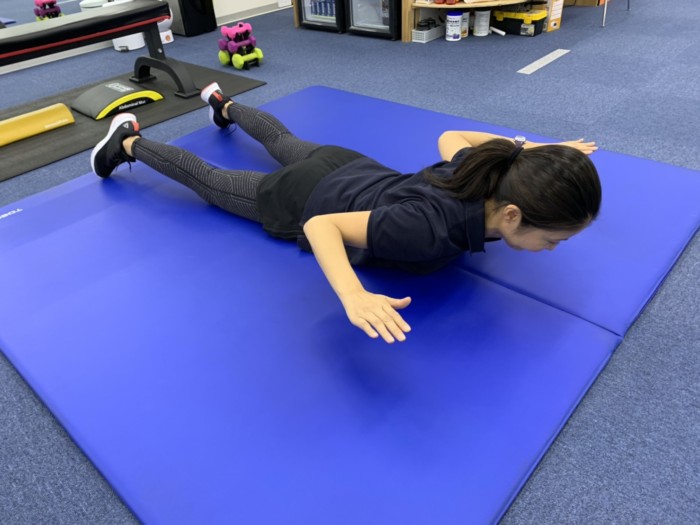 そして、背中の中心部(脊柱起立筋)のトレーニングはマットにうつ伏せになり、腕を伸ばしたところから肘を背中に引き付けていきます。週2~3日。10回×3セットくらいが理想です。これなら自宅でもできますよね。