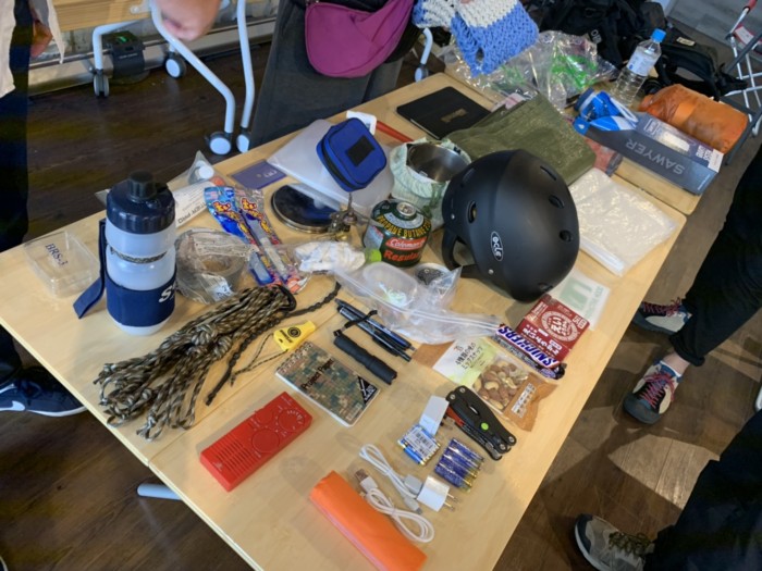 実際の発災にあたっては、72時間をどのように生き延びるかが重要とされていますので俊敏に動けるように持ち物も軽くします。72時間ってなあに?と思った方はスタジオで岡本に聞いて下さい。