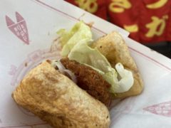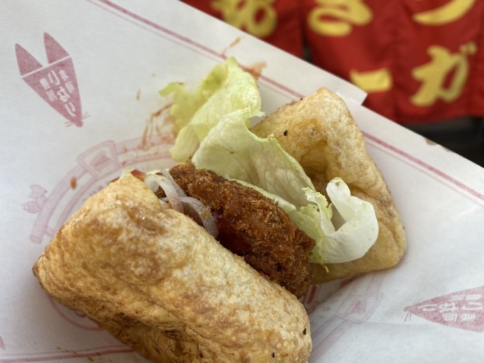 帰りは毎年食べてる「稲荷バーガー」、炙った油げに豚カツがはさんであり美味なり
