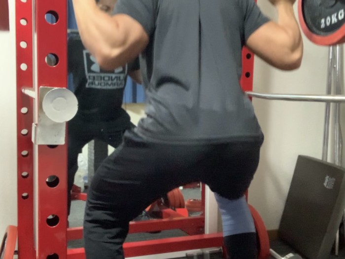 スクワットなど膝関節を使う種目は痛みが出るので、フロスバントを巻いたりサポーターを使用してますよ。