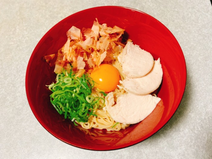 沸騰したお湯に5分ゆでた麺を水洗いして、具材をのせたら完成です。