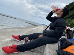 目的地の海に付くなり、石田トレーナーは鞄からプロテインを取り出し飲みだします。