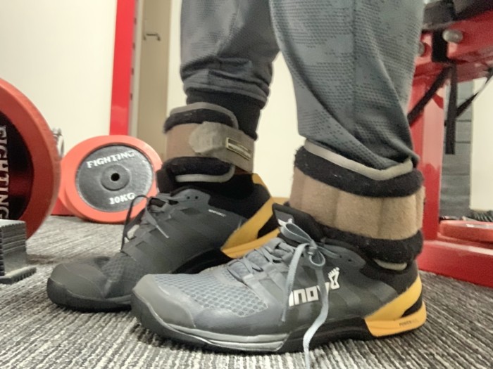 足首に1kgの重りをつけて足上げ腹筋をやりました。
