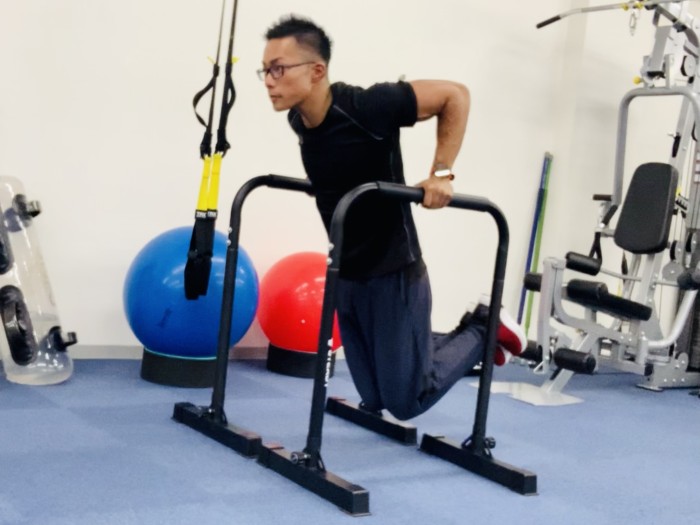 これは胸やニの腕の運動を行う器具で、持ち方を変えると他の部位もトレーニングできます。