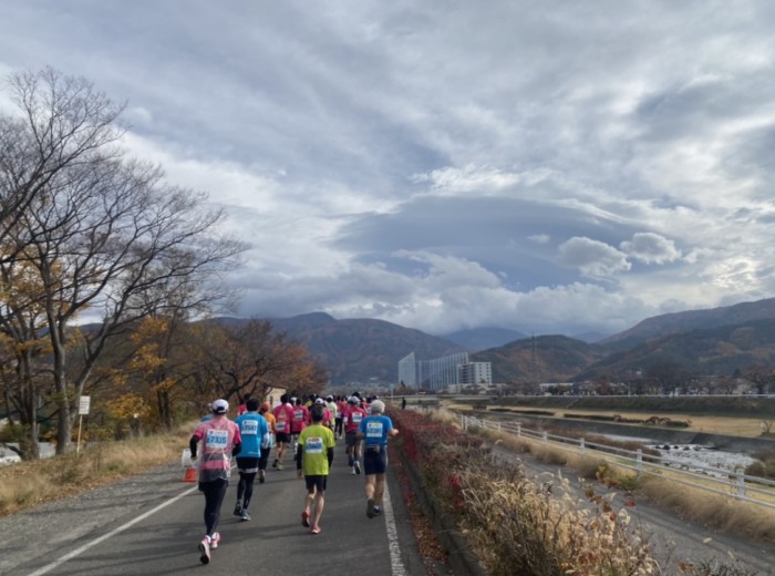 コースは川沿いや街中、山道など色々な場所を走りましたがアップダウンの激しい山道と風で何度も歩こうと思いましたが歩いたら終わりだなと思い1歩も歩くことなくゴールすることができました。沿道では松本市の皆さんが太鼓や笛などどこを走っていても応援してくださっていたので頑張ることができました。