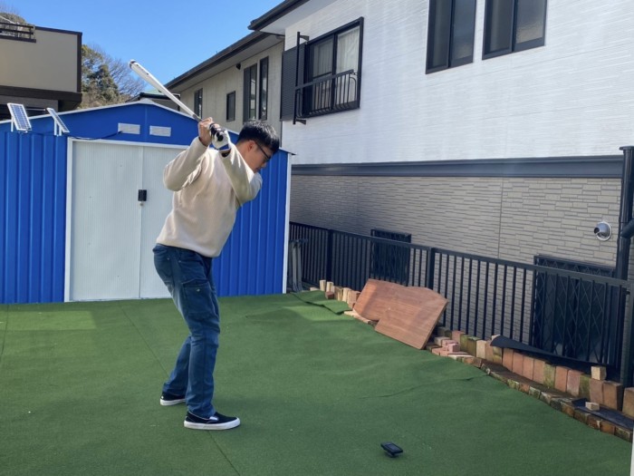 その後は岡本さんに頂いたバット型の重いクラブでスイングです。
