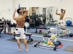 スタジオの鏡を見ながらポージング練習を。