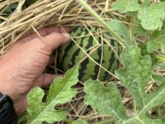 帰ってからは畑の水やり、キュウリや茄子、今年もスイカがしっかりと身を着けました。