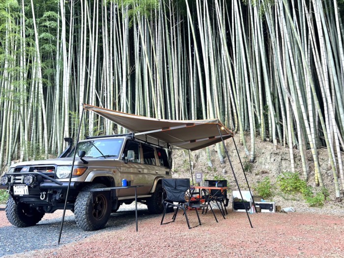 今回の私のキャンプスタイルは車中泊。キャンプ場に付いたら車からサイドオーニングを開いて、テーブルや椅子を並べてと簡単設営です。バンブーと名前が付くキャンプ場だけあって竹に囲まれてのキャンプ開始