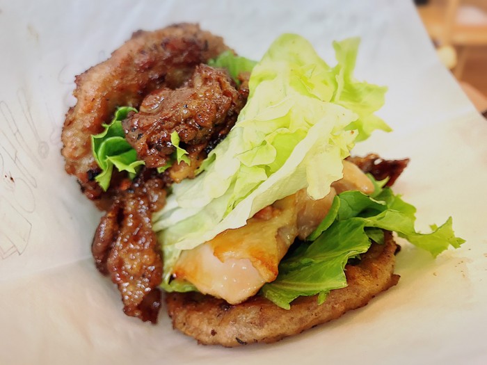 バンズの代わりにパテ(肉)で作ってある肉しか入ってないハンバーガーです。