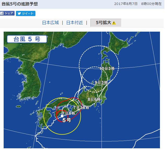 明日7日(月)~8日(火)にかけて、台風5号が東海地方に最接近する為、明日は雨・風ともに強くなるようです。ご家庭や職場においても十分に警戒してください。